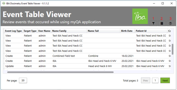 Event Table Viewer – 1: Data filter button, 2: Column filter button, 3: Version information button