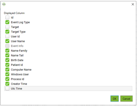 In the current SW version, it is read-only and set to Patient. - Filter by user id or user name / Filter by patient id or patient name / Filter by windows user: