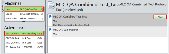 Note that for the Leaf Position Accuracy test, it requires analysis for four gantry angle positions: 0°, 90°, 180°, and 270°. Click the corresponding Start button to execute the test for each gantry angle. - In the Equipment setup section, the parameters, reference image, and the baseline that was set in the Test Setup are displayed.