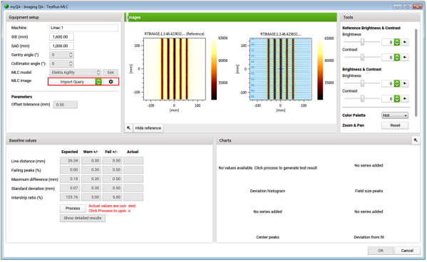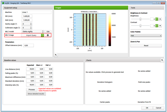 images, protocols or best practice and users should inspect these values.myQA – Imaging QA – TestSetup MLC window – Baseline values and Deviation histogram sections