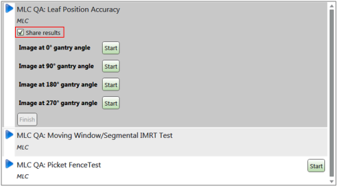 Since the three MLC QA test types use the same images, the analysis results for one test can be propagated to the other MLC QA tests in the test list by selecting the Share results box. This box is available as long as there are more than one of the similar tests in one task.