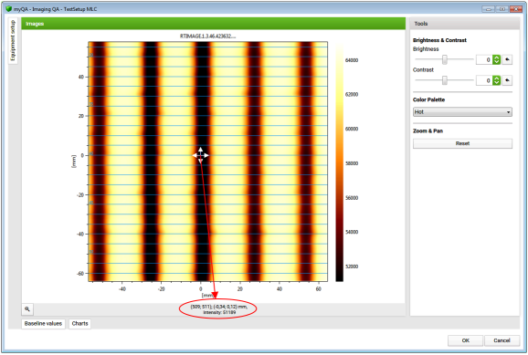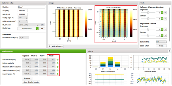 image is further enlarged. The coordinates and intensity of the cursor position is displayed. - Once the isocenter position is correctly defined, start the calculation by pressing the Process button in the Baseline values section. The Actual values are calculated and compared to the specified Expected values. The test results (pass, fail, warning) are displayed with designated tolerance icons. If interested, click Show detailed results to see more result information.