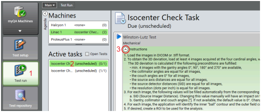 - In Test Run, select the machine under Machines (1), and the activated Winston-Lutz test under Active Tasks (2).