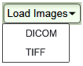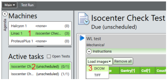 starting an active task in the Test run workspace - Click Load Images to open the dropdown list and select DICOM or TIFF according to the file format (see Section 8.1.1, myQA Machines Reference Guide).