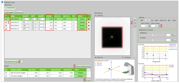 - Inspect the results. To see the detailed results, click the Show detailed results (5) button (Section 8.1.5, myQA Machines Reference Guide). If necessary, change the parameters and re-do the calculation.