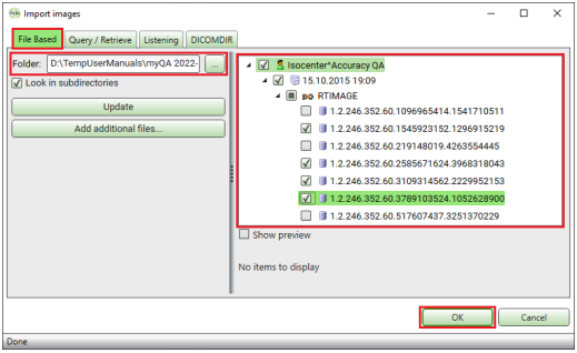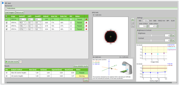 For TIFF images, enter the SID value in the pop-up dialog during file-loading and define the gantry angles in the table of the image parameters manually after file-loading. - Select the boxes of the images (1) to be tested.