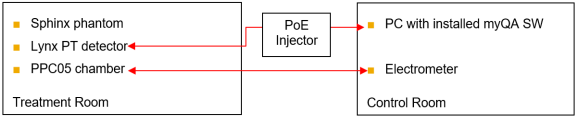 To perform output consistency verification, the PPC05 chamber is inserted into the phantom and is connected to an electrometer compliant with IEC60731 and located in the control room.