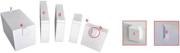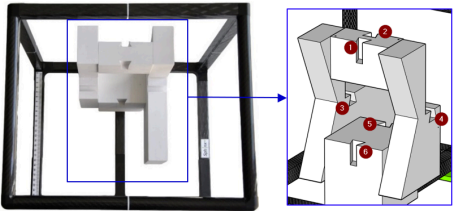 Sphinx phantom with basic blocks, left: top view, right: fixed blocks which the dovetail slots are numbered, rear view