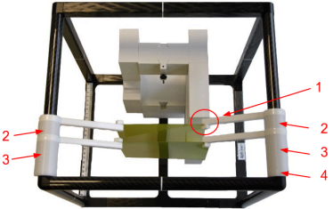 Lynx PT detector - Sphinx phantom system on the PPS, the orientation of the Lynx PT is at 0˚. 1: Phantom, 2: Sphinx: Scintillator, 3: Markers