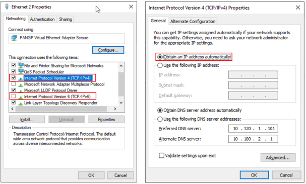 - In Ethernet Properties, deactivate Internet Protocol Version 6 (TCP/IPv6); click to highlight Internet Protocol Version 4 (TCP/IPv4); click Properties, and then OK (see the screenshot left). The Internet Protocol (TCP/IP) Properties dialog opens (see the screenshot right).
