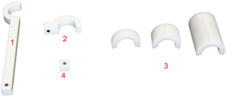 1: Long clip, 2: Short clip, 3: Spacers, 1 cm, 2 cm, 5 cm, 4: Magnet