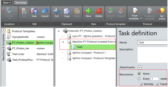 - While the protocol template is selected, click New and enter the name of the task template and optionally a description in the Task definition. Then define a task schedule in Recurrence.