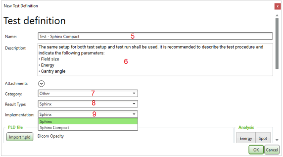- Enter the name of the test (5) and optionally a description (6).