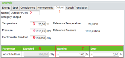 electrometer readout (5) (not yet corrected for temperature and pressure). The reference temperature and pressure are pre-defined in the SW. The expected dose value (6) will be calculated automatically based on these values.(ii) For the Couch Translation test: Enter the expected values
