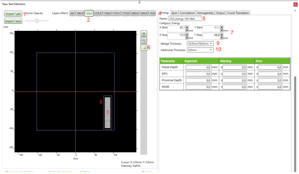 - To define an OOI for a test, e.g., an energy test, select an energy (2) by clicking the corresponding button, e.g., 103.0 in Layers (MeV). Note that the pld pattern for this energy is illuminated (3).