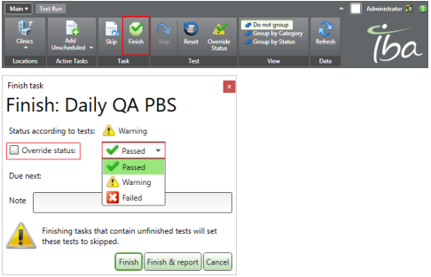 To finish the tests, click Finish in the lower-right corner. The summary of the test results is displayed. - To finish the task, click Finish in the ribbon. If the overall status should be changed, checkmark the