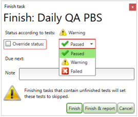 Override status box, and then select a new status in the combo box.For more information on the Finish Task dialog, see Section 2.1.4, myQA Machines User's Guide