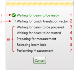 The beam status ‘ready’ is retrieved by the system: the particle therapy machine is ready to start the preparation of a new irradiation. The myQA is waiting to retrieve the Couch Translation vector calculated by the dedicated software. - Wait for beam to be prepared