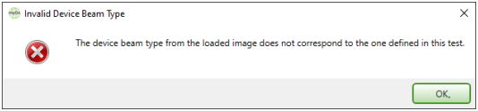 If the beam type of the loaded DICOM image is different from the one specified in the protocol, a warning message appears and the image cannot be loaded.