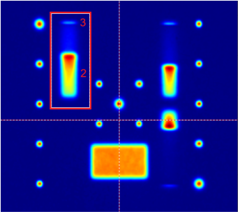 To prevent this problem from happening, it is recommended to use a higher MU/spot for the spot close to the edge of the block (3) compared to the ROI (2). This ensures that the SW can distinguish it during analysis.