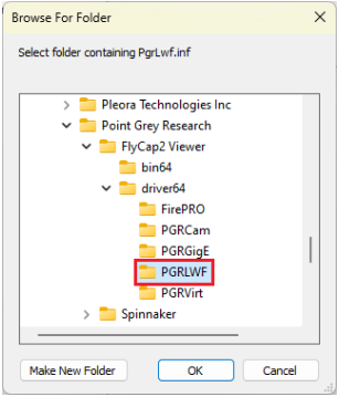 - Select the folder C:\Program Files\Point Grey Research\FlyCap2 Viewer\driver64\PGRLWF and click OK.