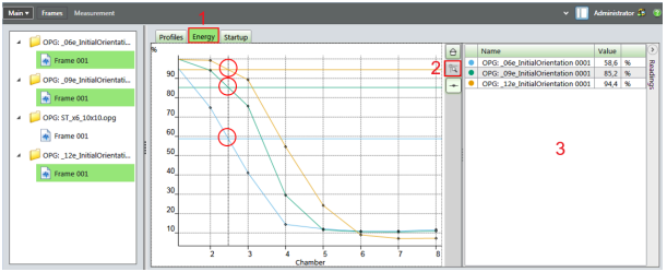 - Place the computer cursor on the profile cursor (make sure the button (2) is de-selected). Press the right mouse and drag it to the desired position. The signal reading is shown in the table on the right (3).