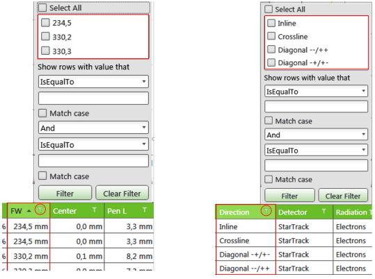 Each item has a filter for display selection. Clicking the filter icon will open the Filter dialogue. Only the Name filter uses the free-text fields, i.e., part of the name can be also used for filtering. The rest of the filters use the options of the parameter for filtering, i.e., the full names of an option are used for filtering:
