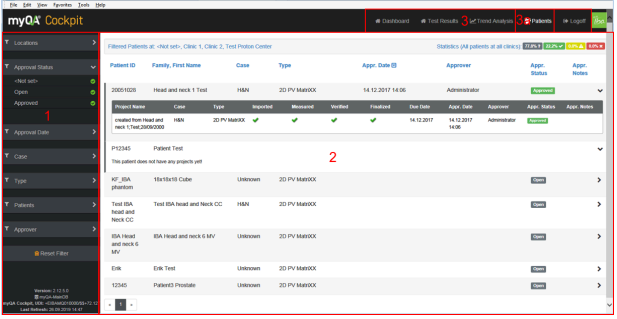 The Patients QA page contains a navigation panel (1) and a patient QA table (2) that shows information