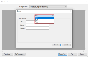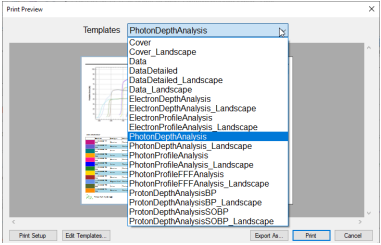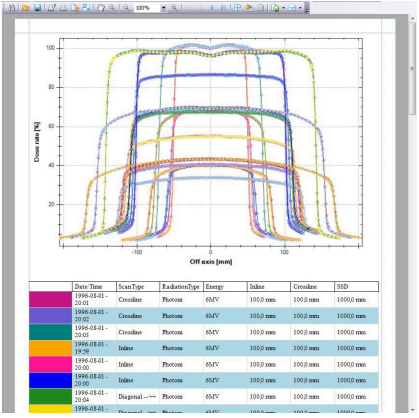 The measurement curves and parameters currently displayed in the myQA Accept window can be printed out as a report with a printer or save as a file in PDF, Excel, RTF or Word format. The SW provide some print templates. Users can also create their own templates