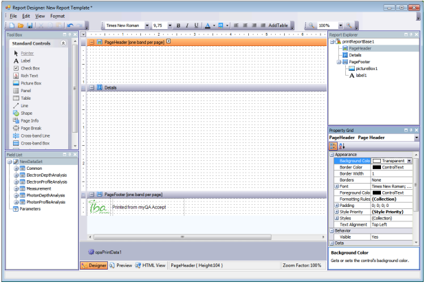 - In the Report Designer window, click File > New in the menu. A new print template is opened which contains a Page Header band, a Details band, and a Page Footer band.