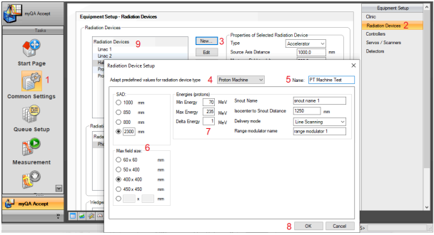 and enter the machine name (5). Select a SAD and maximum field size (6) (for display only). Enter the energies (7) with which a list of energies is created. The created energies will be available in the Energy dropdown list in the Queue Setup page. The value in the Delta Energy box is the energy interval in the energy range of Min Energy and the Max Energy. - Click OK (8). The machine will be saved and appears in the Radiation Devices list (9).