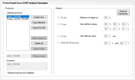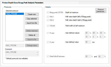 To access the protocols, click Common Settings > Analysis Parameter > Proton Depth Dose Bragg Peak or Proton Depth Dose SOBP.