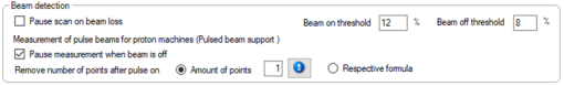 - Enter the thresholds in Beam on threshold and Beam off threshold. A threshold is a percentage of the normalized maximum value. It is recommended to set Beam on / off threshold to 8% / 12%.