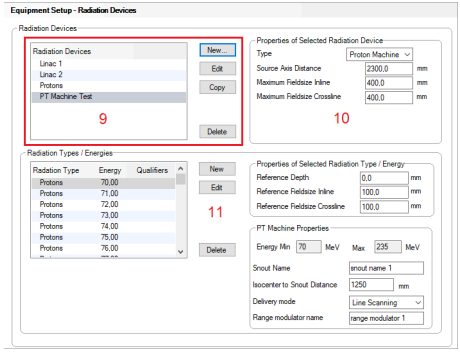 - Select the machine in the Radiation Devices list (9). Its parameters are displayed.