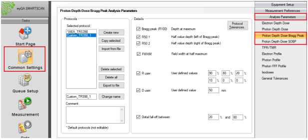 - Select the Analysis protocol in Common Settings – Analysis Parameters - Proton Depth Dose Bragg Peak or Proton Depth DoseSOBP.