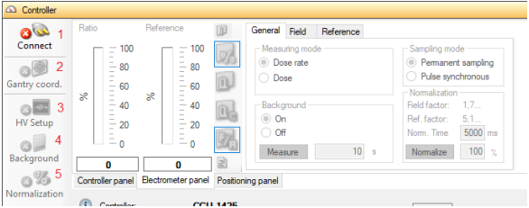 - Turn on the beam. Click Normalization (5). The normalization time is defined in Electrometer panel > General > Norm. Time (5s by default).