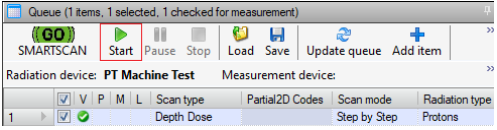 - When a PT machine is selected in Queue settings, Radiation Type is automatically set to Proton and the SOBP (4) and Single Spot (5) options becomes available.