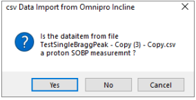 - If the imported data does not have information about the Bragg Peak type (BP or SOBP), a popup dialog appears. Click Yes if it was a SOBP measurement or No if it was a BP measurement.