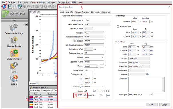 - Check mark the SOBP checkbox (4), the SOBP analysis protocol will be used for analysis. If this box is unchecked, the Bragg Peak analysis protocol will be used for analysis