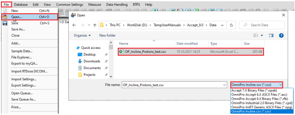 - In the Open browser, select OmniPro Incline (*.csv) as the file type, select the file, and click Open.