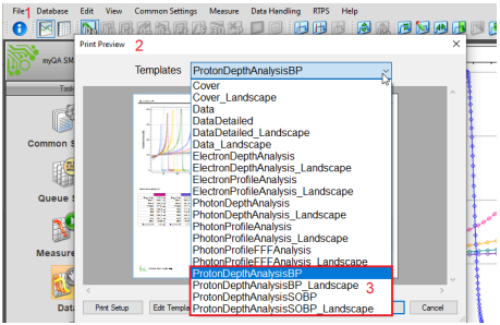 - In the main menu bar, click the File menu (1) and then select Print… The Print Preview dialog (2) open. There are 4 print templates available for the PT applications (3).