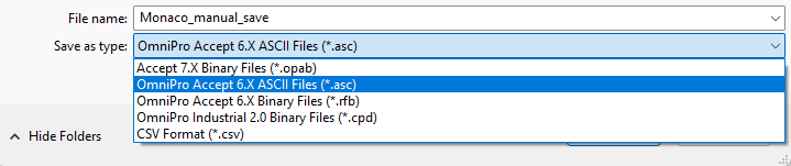 In the Save As dialog, select the save location, enter the file name, and select *.asc as the file type.