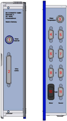 The connection box contains connectors for the three motors/position sensors, the drive control cable, the remote control, water reservoir, lift table, TMR probe, water temperature sensor and service socket.