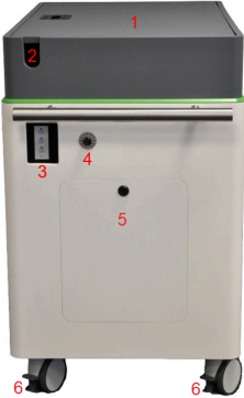 Storage compartment of the water reservoir; 1: Water hose; 2: Chamber detector; 3: CCU; 4: Cables; 5: Key of utility door.