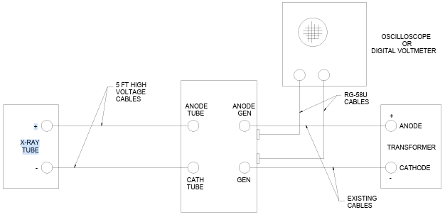 - Connect the scope to the Anode + Cathode output or to the separate outputs if switching between individual and summed outputs is desired. The exact switching will vary due to differences in x-ray high-voltage generator controllers. Refer to specific instructions for the model being calibrated.