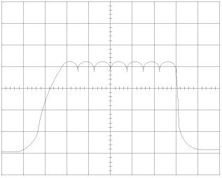 Current measurements in three-phase equipment may be read directly from the oscilloscope trace. Figure 8 shows a typical three-phase current waveform. By visual inspection, the average value may be read from the oscilloscope trace. The scale factor is 1 millivolt per milliampere. Through practice, the average area of ripple above and below the estimated current value should be equal. The x-ray tube is an emission limited device. Normally, the peaks of the current waveform have a lower slope than the voltage waveform and therefore the ripple in the current will be smaller than the ripple in the three-phase voltage.