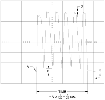 Figure 9 illustrates the waveform of a typical single-phase generator for an exposure of 200 mA, 120 kVp, 1/20 sec. A properly timed single-phase generator will contain one or more complete pulses, each lasting 1/120 of a second on a 60 Hz power line, or 1/100 of a second on a 50 Hz system. Thus, a single-phase exposure time for normally operating equipment is N x 1/120, where N is the number of pulses. For longer exposures, the time may be read from the start of the first major pulse to the end of the last pulse. The trailing off of the voltage, (region C of Figure 9), is due to cable capacitance. Cable capacitance is also responsible for the failure of the voltage to drop to zero at the end of each pulse.