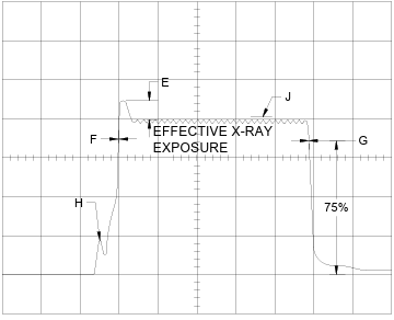 Figure 10 illustrates the waveform of a typical three-phase generator for an exposure of 700 mA, 80 kVp, 1/20 second. The kVp for this exposure would be the amplitude of area J. The overshoot area, E, is not significant in this particular exposure because the dominant radiation is of the lower kVp value. The peak value must not, however, exceed the rating of the tube of generator, as it does contribute to the voltage stress on the system.
