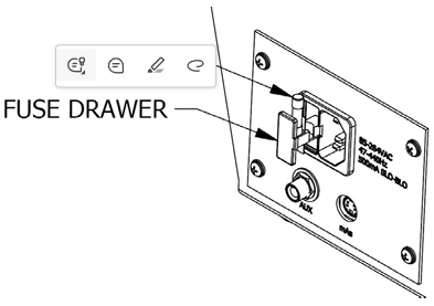 - On the rear of the unit, next to the AC cord connector, pull out the fuse drawer. Replace the fuse if necessary with 5mm x 20mm 500mA slo-blo fuse, LITTELFUSE 0219.500 or equivalent.