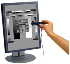 Attach the Luminance Adaptor to the base by screwing it on in the clockwise direction. Ensure that the adaptor is fully attached so that the actuator switch is depressed instructing the system to make luminance measurements in units of candela/meter2 (cd/m2). Position the sensor as shown below over the screen area to be measured. Press and hold the AGLS activator button for several seconds. The luminance value in cd/m2 will appear in the display; when it stabilizes release the button to capture the value.